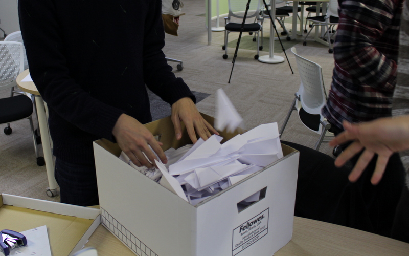 ワークショップでは決められた時間内にどうすれば多くの紙飛行機を作って飛ばすことができるのかをチームごとに考え、競いました。